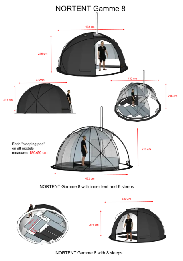 NORTENT Gamme8 EXTREMEは、薪ストーブをインストールできるようにデザインされ、5本のポールで構成される自立型ドームテントです。