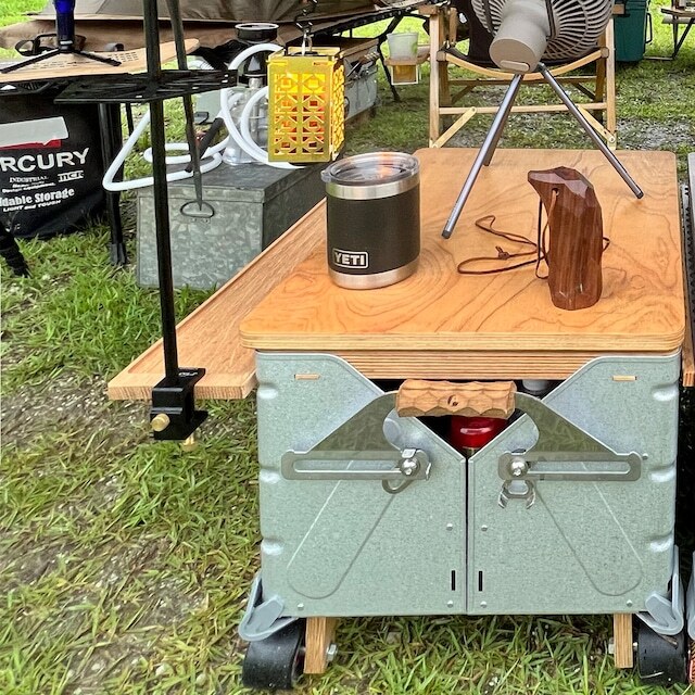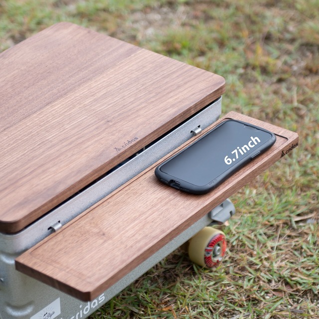 愛知のガレージブランド「クリダスガレージ」より、sc_sidetable50登場です。スノーピーク社のシェルフコンテナ50側面に取り付けるサイドサイドテーブルです。オイルステインで仕上げています。木材は、フローリングなどに用いられる突き板生産時に発生する”ツキジリ” と呼ばれる廃棄されてしまう部分を利用することで木質資源を最大限有効活用しています。