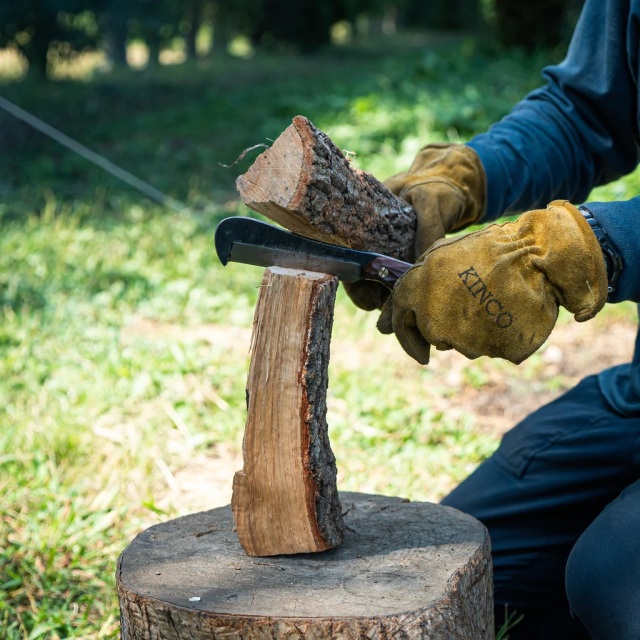 刃厚が6㎜もある極厚刃は、薄い刃に比べ軽い力で薪を左右に押し広げやすく、バトニングに最適なタフブレードです。また高機能鋼材で鍛造したフルタング刃だから、とにかく丈夫で折れにくく安心して使えます。