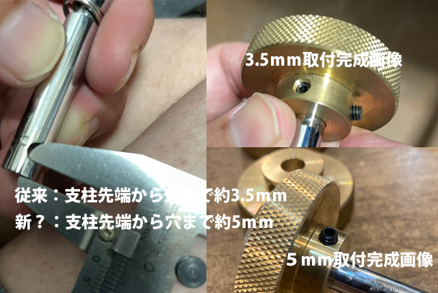 2021/09/08追記:お客様からの情報提供で、武井ハンドルの支柱穴位置の仕様変更が確認されました。従来製品の場合、支柱先端からイモネジ穴までが約3.5mmとなっていますが、新たに確認された個体は約5mmとなっております。当店の製品は3.5mm用で設計されているため、5mm支柱に取り付けた場合、イモネジが全てネジ穴に収まらず飛び出る形での固定となります。固定はされますが、ネジ穴に合わせる場合は支柱をヤスリ等で1.5mm程度削る加工が必要となります(上記画像参照)。商品をご検討中の方は、お手持ちの武井ハンドルをご確認の上、購入を検討願います。