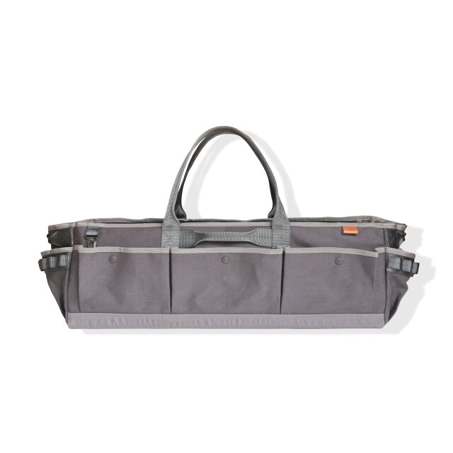 今回新登場のロングサイズは、一般的なロールトップテーブルが収納できる横長のサイズ感。横幅が約80cmくらいまでの長物を収納する事ができます。大きくて重さのあるロールトップテーブルの脚と天板をまとめて収納。被せにジッパーが付いた仕様の間口は使い勝手よく、荷物が飛び出す事なく綺麗に収まります。ポールの収納にも便利で80cm以上ある場合の荷物でも、被せ部分をうまく使う事により持ち運びが可能です。