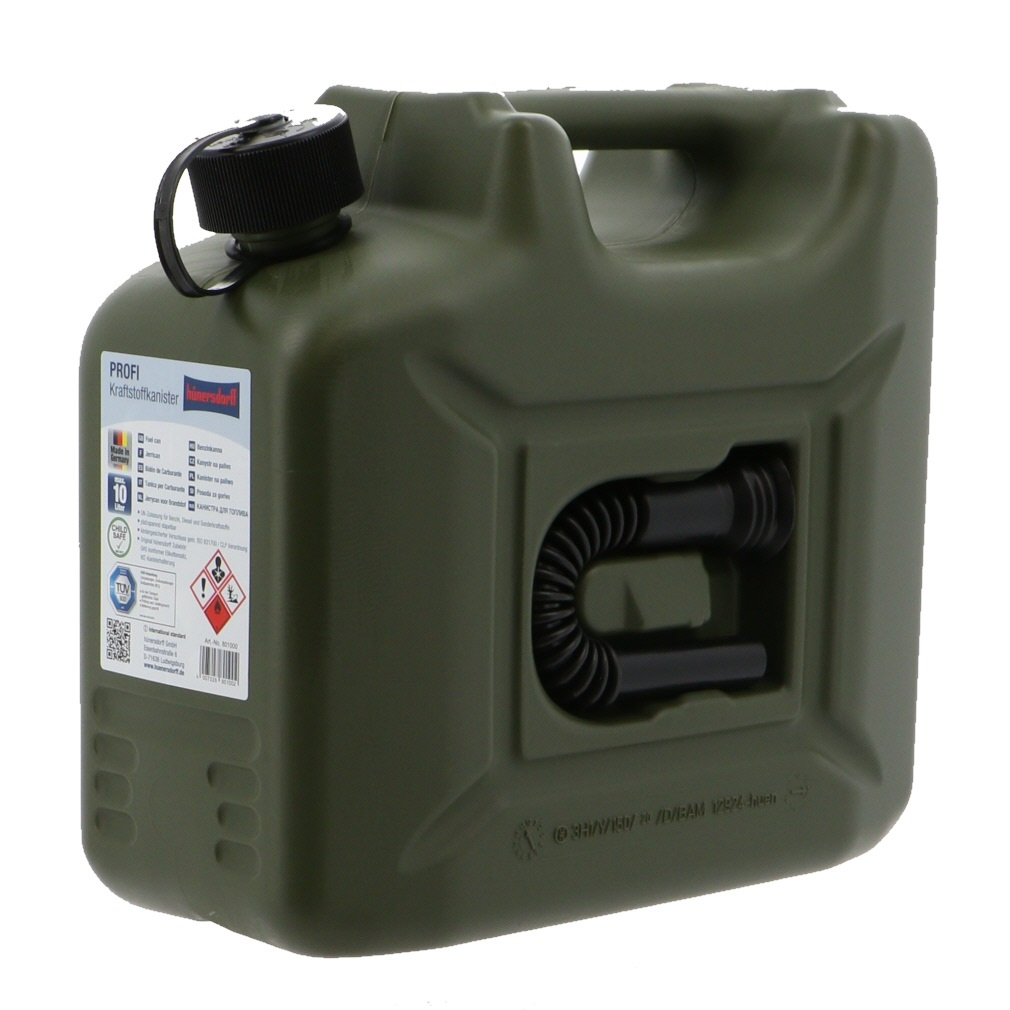 ヒューナースドルフ社の高密度ポリエチレン製燃料キャニスター。注ぎ口は細めでボディに収納されたノズルを装着することで液体を効率よく注ぎ込むことができ、ロック機構付のキャップは密閉性が高く、万一倒れても液体が漏れる心配もありません。消防法で禁止されているため、ガソリンを入れないでください。