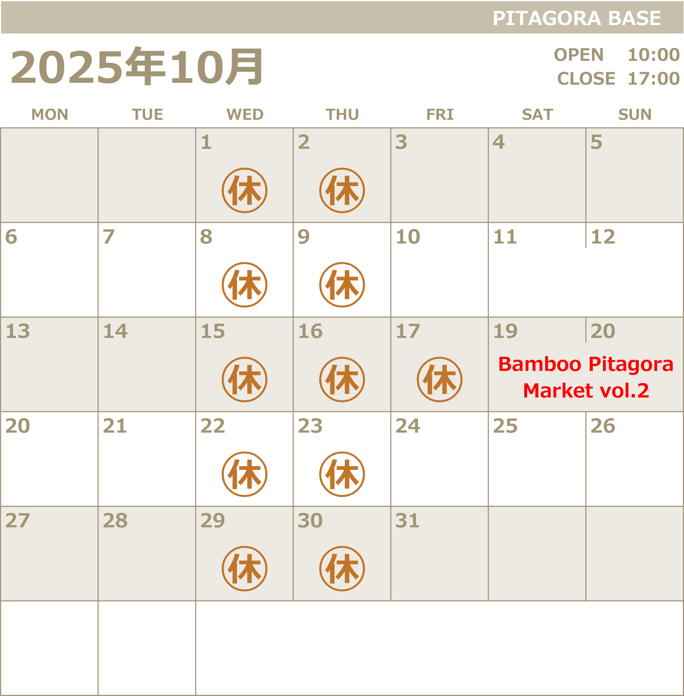 定休日は水・木曜日、営業時間は10:00~17:00となります。但しイベント出店等でイレギュラーな定休日もございますので、ご来店の際は下記営業カレンダーをご確認ください。